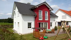 Der farblich abgesetzte Erker strukturiert das Gebäude von außen sehr harmonisch und verdeutlicht die zentrale Lage des 2-geschosshohen Nebengiebels. Durch die perfekte Ausnutzung der Räume wird das unterkellerte Gebäude eine Wohnoase für mindestens 4 Personen. Die 3 Schlafräume im Daschgeschoss sind großzügig und lichtdurchflutet. Das gemeinsame Badezimmer im DG besticht durch eine begehbare Dusche und pfiffige Lösungen im Bereich der Waschtische. Im Erdgeschoss ist trotz der großzügigen Treppe ein Gäste-WC und kleiner Vorratsraum angeordnet. Das vollunterkellerte Gebäude bietet ausreichend Fläche für einen großzügigen Hobbyraum. Die ländliche Lage des Objektes unterstreicht den klassischen Stil und das Wertedenken der Bauherrschaft.