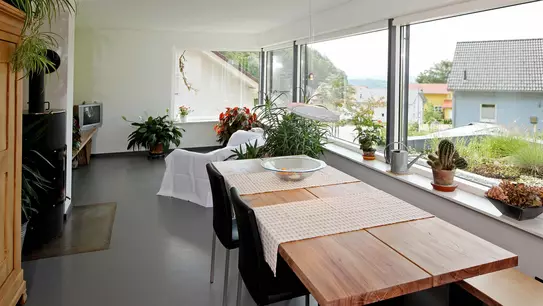 Geradlinig und klar in der Form, aussagekräftig in der Farbgestaltung, hell und lebendig im Inneren. Das Haus Breitenbach gehört mit seinem Flachdach zu den angesagtesten und modernsten Entwürfen unserer Zeit. Reduziert auf die kubische Grundform braucht es nichts mehr, als nur sich selbst, um den Betrachter in seinen Bann zu ziehen. Hierbei wirkt das Erdgeschoss, sowohl in Farbe und Material abgesetzt, schlank und elegant. Die schicken Fensterflächen über Eck sind optisch ein Blickfang und lassen viel Licht ins Haus. Den ganzen Tag.