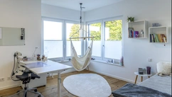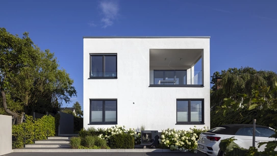 Haus Burkhardt nutzt den Platz effizient. Das klare, rechteckige Design im Bauhaus-Stil mit weißer Fassade, Flachdach und bodentiefen Fenstern passt mit nur 8,61 m Breite sowohl auf schmale Stadtgrundstücke als auch auf größere Areale. Der Eingangsbereich mündet in eine geräumige Diele, von wo aus die Bewohner Zugang zu den privaten Zimmern haben. Zwei Kinder- und ein Arbeitszimmer sowie ein separater Schlafbereich mit Ankleide und voll ausgestattetem Badezimmer bieten auf insgesamt 108 m² reichlich Rückzugsmöglichkeiten. Eine offene Treppe führt von der Diele aus in das Obergeschoss mit einem 66 m² großen Wohn-, Koch- und Essbereich. Zwei Loggien mit jeweils 12 m² schaffen die Verbindung ins Freie. Ein 13 m² großer Medienraum kann auch als zusätzliches Arbeitszimmer genutzt werden. Haus Burkhardt ist teilunterkellert und bietet mit 56 m² reichlich Platz für Hobbys, Vorräte und Haushaltsutensilien. Ein 16 m² großer Technikraum und zwei weitere Räume mit 11 und knapp 20 m² werden über Lichtschächte mit Tageslicht versorgt und komplettieren das Platzangebot.