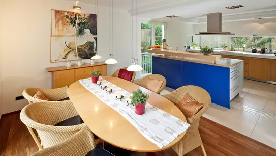 Man kann sich gar nicht entscheiden, wo denn nun der Lieblingsplatz sein soll. In dem Licht durchfluteten Essbereich? Im Anbau mit der extra großen Fensterfront? Oder auf der Terrasse, die wie ein breiter Steg den Pool einfasst. Der farbig abgesetzte Anbau mit seinem Flachdach trennt sich äußerlich optisch vom Haus und wirkt als eigener Baukörper. Von innen gesehen hingegen vereint er sich mit der Terrasse und vergrößert den Wohnbereich.