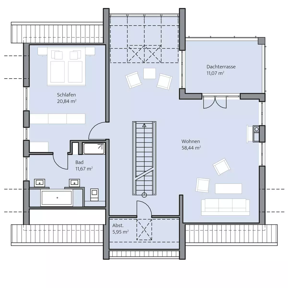 Energiebewusst gibt sich die Anordnung der Fensterflächen des Hauses: reduzierte Fensterformate auf der Nordseite, großzügige Belichtung auf der Südseite, dort im Mittelteil sogar mit einer Wintergarten ähnlichen Verglasung bis ins Dach hinein. Die fortgesetzte vertikale Teilung der Fenster setzt optische Akzente. Im Südwesten wurde mit einer Dachterrasse die strenge Symmetrie des architektonischen Konzeptes bewusst gebrochen und ein geschützter Außenbereich geschaffen. Einen besonderen Akzent im Inneren setzt hier die fast schwebend in der Gebäudemitte platzierte geradläufige Treppe.