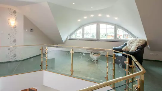 Das stilsichere Landhaus der Familie Mühlberger ist schon von außen ein wahrer Hingucker! Weiße Bogenfenster, eine pastellgrüne Fassade, ein kunstvoll geschnitztes Eingangselement, das dunkle Walmdach, die große Terrasse hinter dem Achteck-Segmenterker, der komfortable Lichthof geschützt hinter der Garage: Auch wer nicht vom Landleben schwärmt, dem gefällt dieses Haus auf Anhieb, das sich auf einer Fläche von rund 17 x 14 m (ohne Anbauten) ebenerdig entfaltet (mit Ausbaureserve im Obergeschoss).