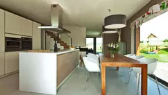 Die Räume auf insgesamt rund 194 m² Wohnfläche sind in extrovertierte Kommunikationsbereiche und introvertierte Rückzugsbereiche unterteilt. Viel Platz und die offene Gestaltung laden zum Durchatmen ein. Und auch das über ein geradläufiges Faltwerk mit Geländer erschlossene Obergeschoss präsentiert sich als durchgeplante Ebene. Ein Elternschlafzimmer, drei gut geschnittene Kinderzimmer sowie zwei Bäder finden hier Platz.