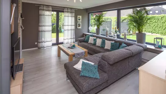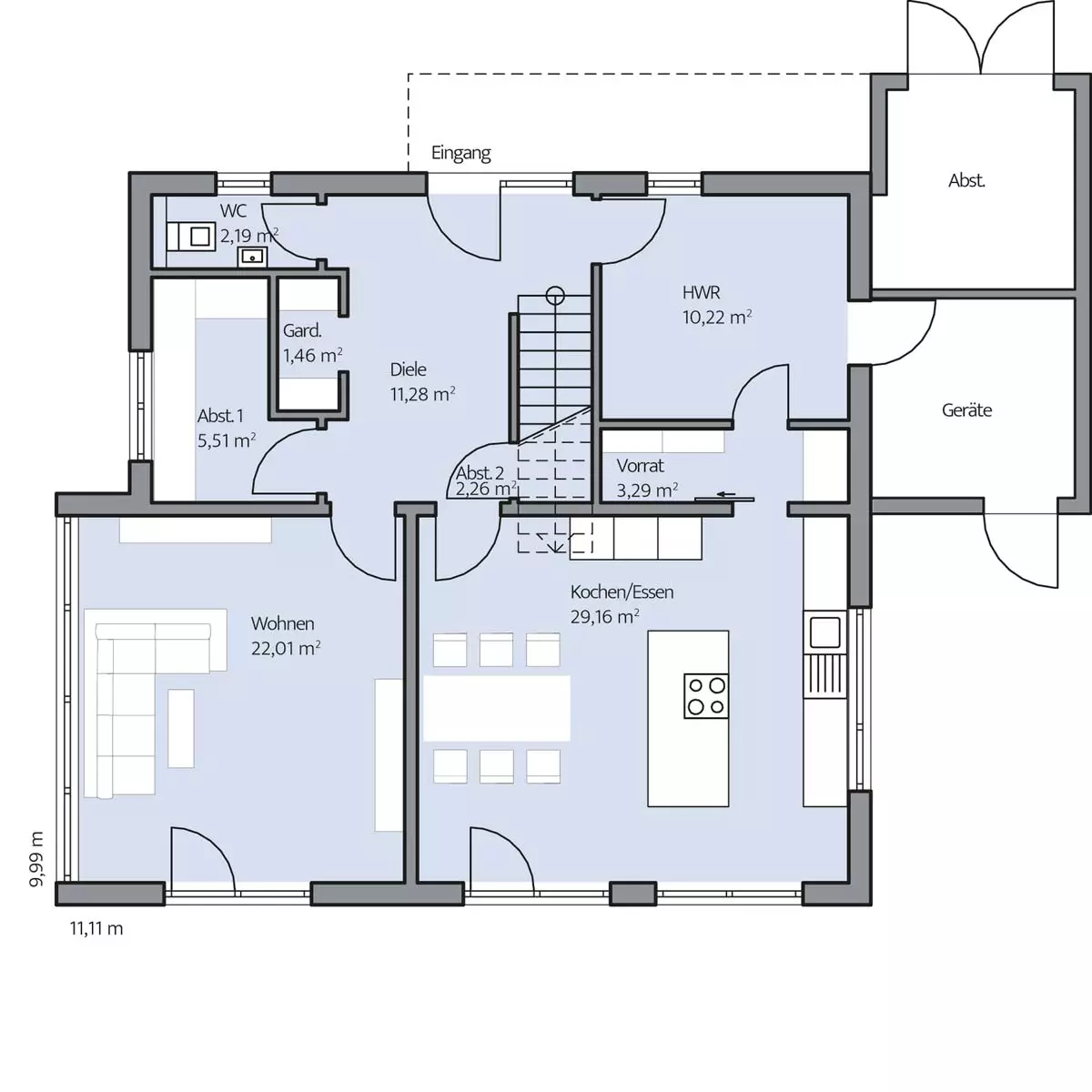 Innen profitieren die Hausbewohner von der zweigeschossigen Bauweise, die trotz der kompakten Außenmaße des Grundbaukörpers (11,11 x 9,99 m) die Planung großzügiger, gut belichteter Individualräume möglich macht. Dank Abstellkammern, Fahrrad- und Geräteschuppen, einem Wirtschaftsraum und dem ausgebauten Spitzboden kann man auf den Keller gut verzichten. Ein weiteres Plus: die gut gedämmte Außenhülle, die zusammen mit einer Gas-Brennwerttherme spielend die Vorgaben der EnEV erfüllt.