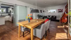 Das in klassischem Stil von BAUMEISTER-HAUS gebaute Haus Steinmann ist ein zeitloses Zuhause für eine mittelgroße Familie. Dank der individuellen Planung konnte es optimal in das Hanggrundstück integriert werden und verfügt so in Richtung Garten über 2,5 Geschosse sowie einen sehr großen Balkon. Das Haus Steinmann ist voll unterkellert, mit einem Technikraum, einem Kellerraum sowie einem fast 37 m² großen Hobbyraum. Im Erdgeschoss des Massivhauses befinden sich in der einen Haushälfte ein Duschbad, die begehbare Garderobe, die Treppe ins Dachgeschoss sowie die verschließbare Küche mit praktischem Zugang zum Balkon. Durch zwei elegant-moderne Schiebetüren gelangt man in die zweite Haushälfte, die komplett vom Wohn- und Essbereich eingenommen wird. An den Essbereich und die Küche schmiegt sich der 28 m² große Eckbalkon. Die Privaträume im Dachgeschoss umfassen zwei gleich große Kinderzimmer, das Elternschlafzimmer sowie ein großzügiges Familienbad mit zwei Waschbecken, einer Dusche und einer Badewanne.